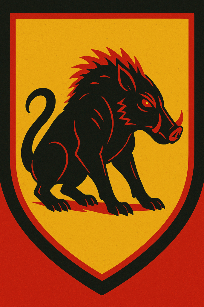 | Sigil: A Black Manak Boar on a field of Sunlit Gold with Pure Crimson Mane |